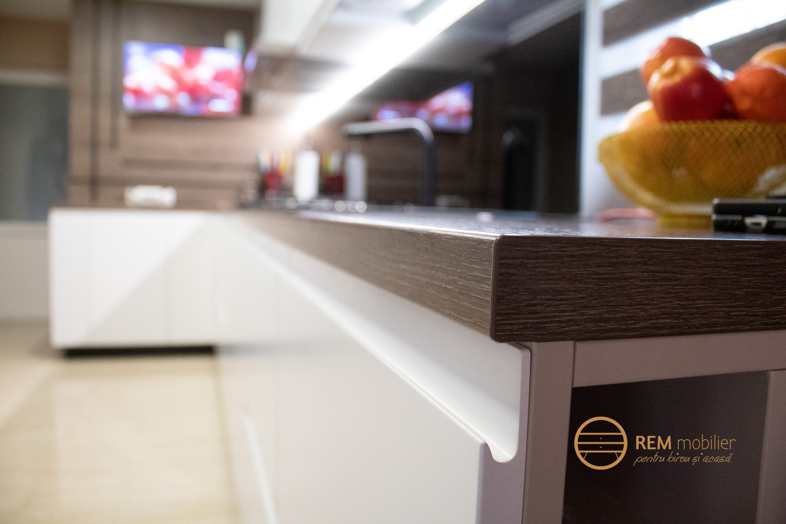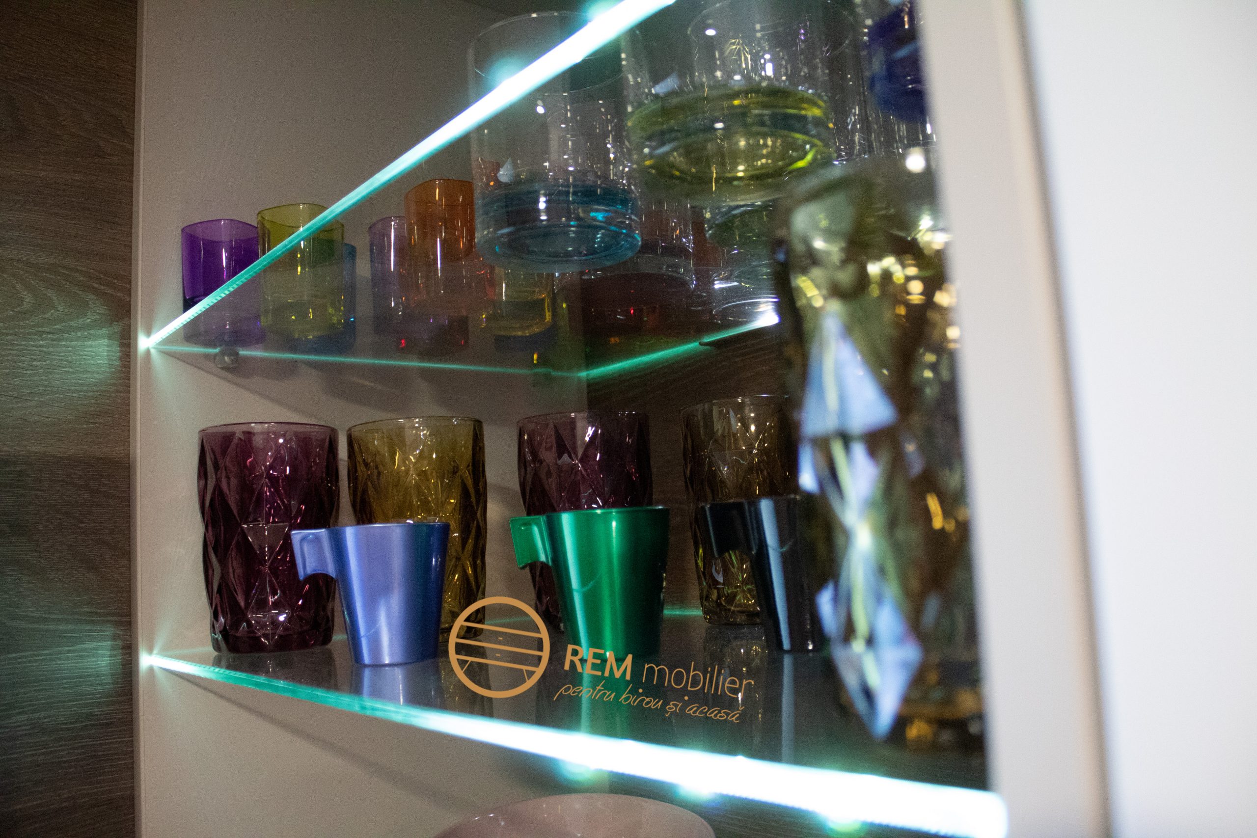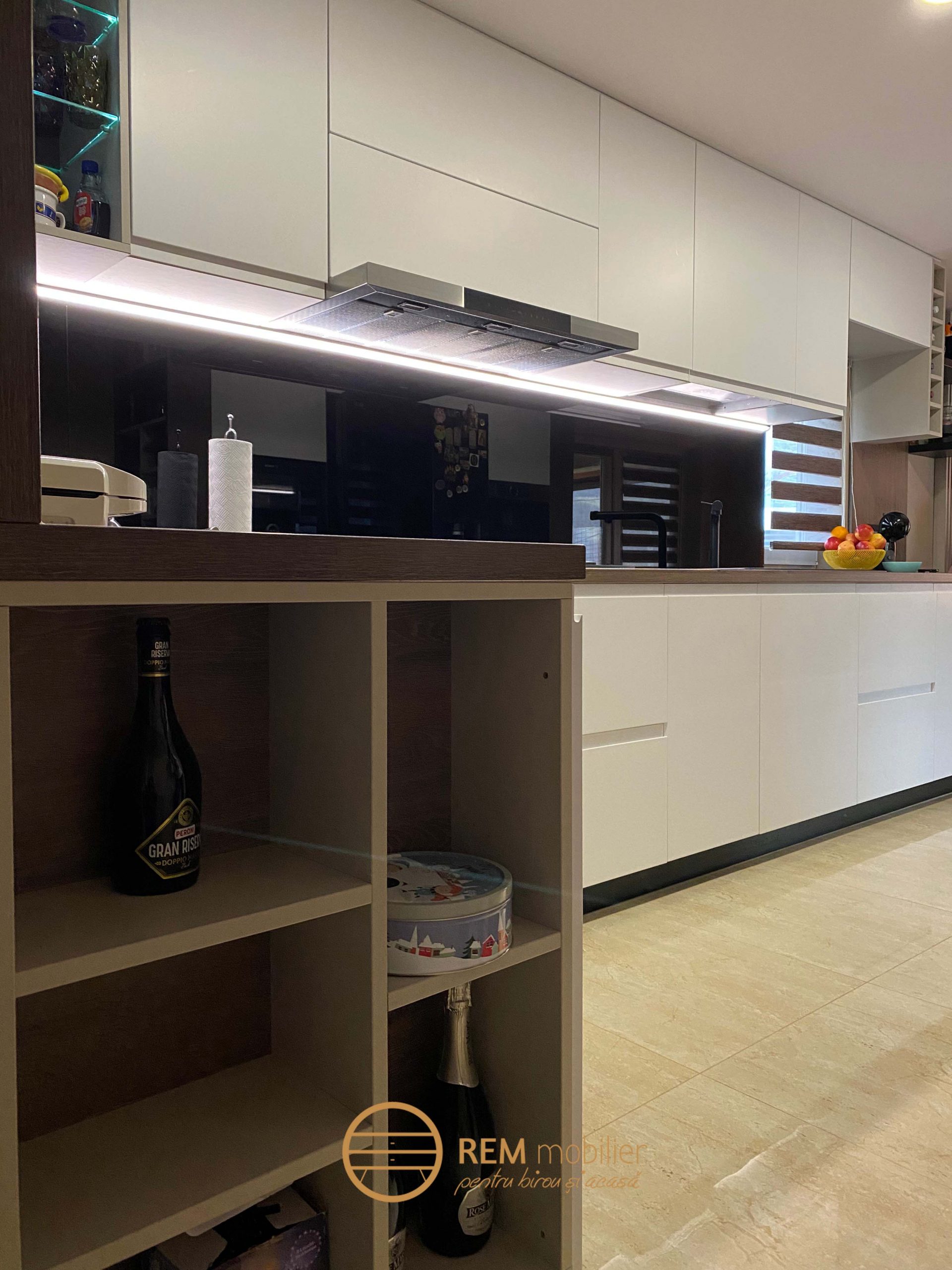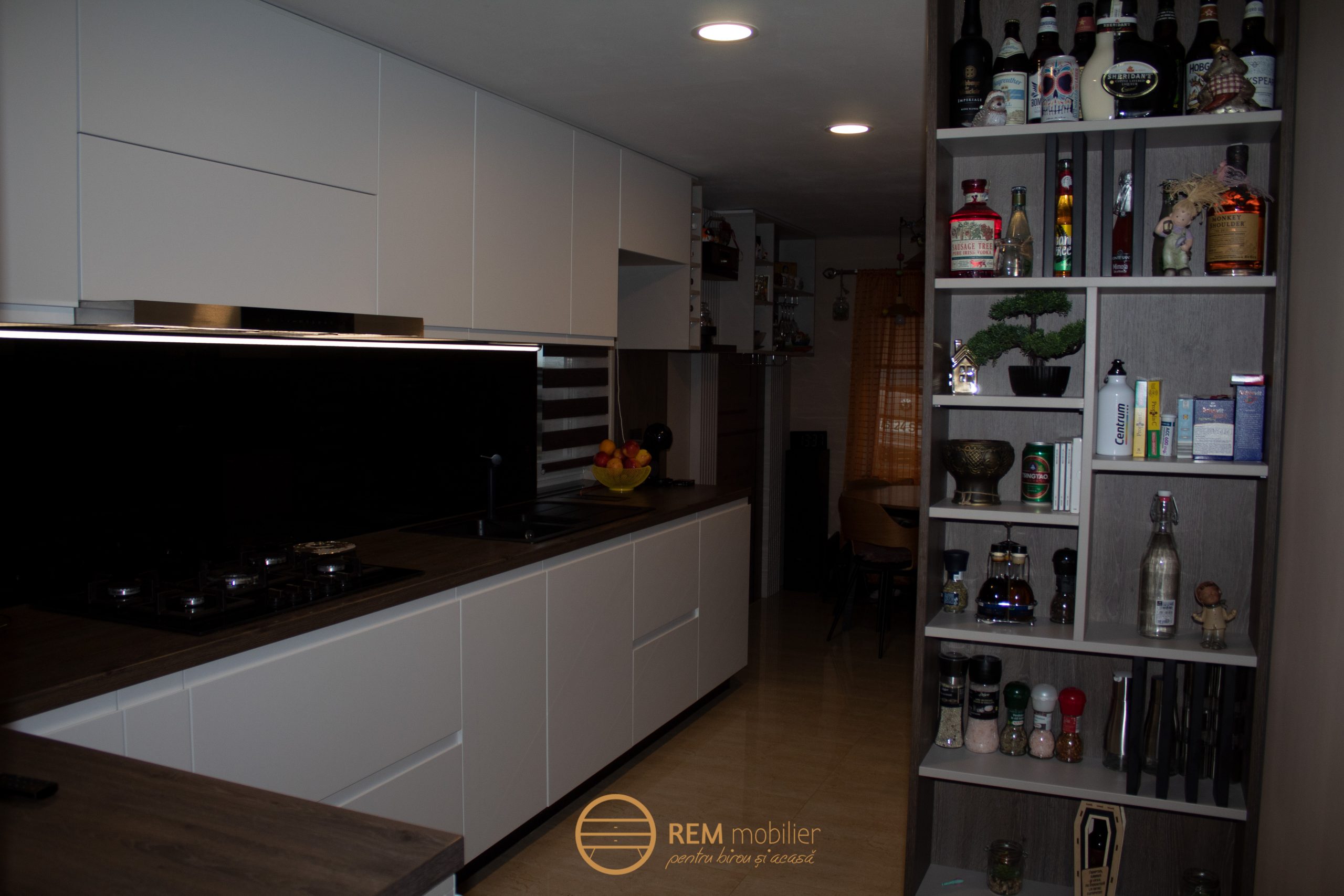 Realizata din MDF VOPSIT si pal, cu insertii metalice, prize in blat, sticla vopsita, banda led, polite cu banda led, spatii depozitare decoruri si imbinari cat mai ascunse.