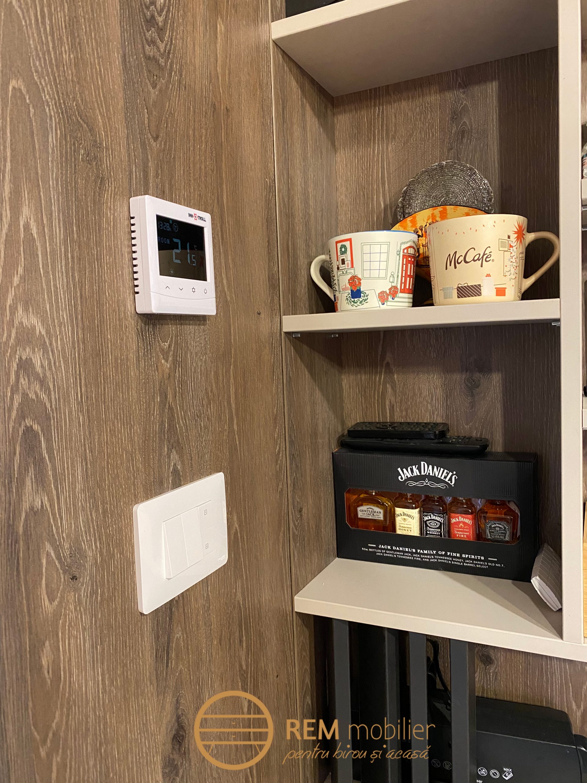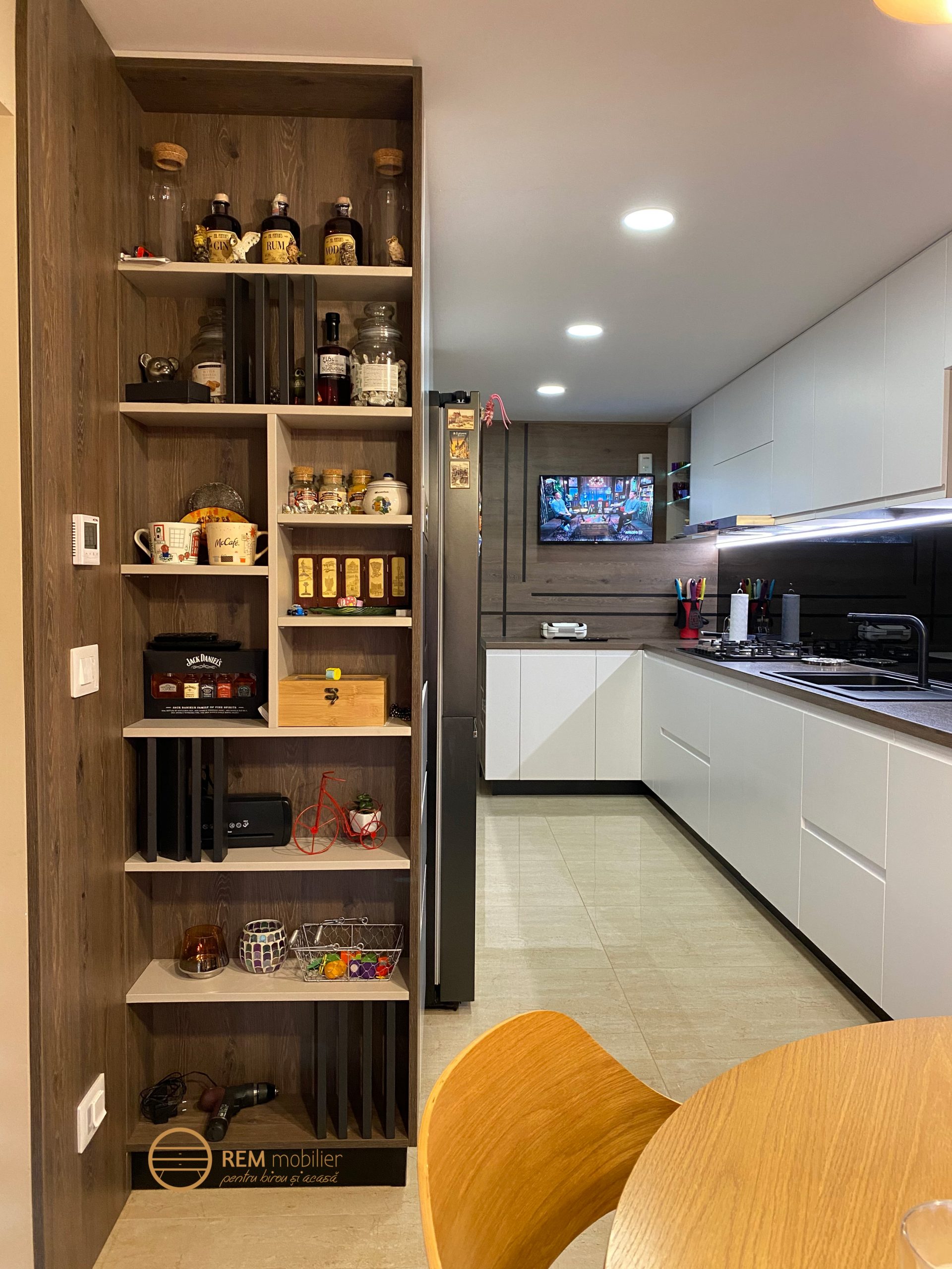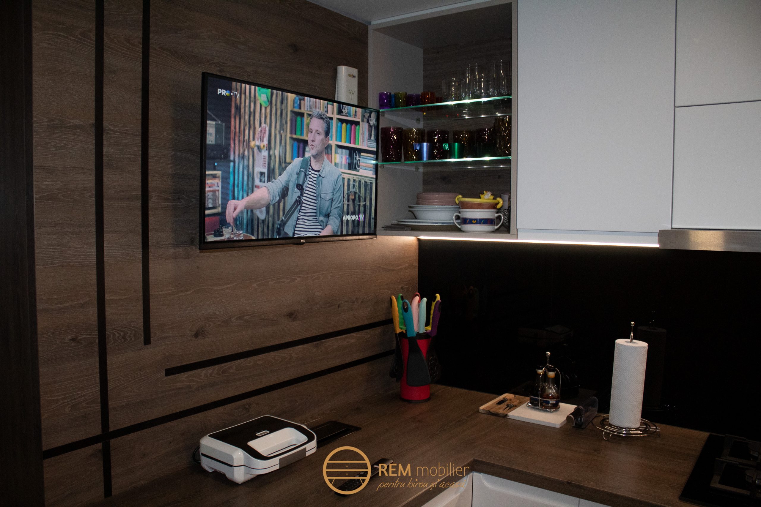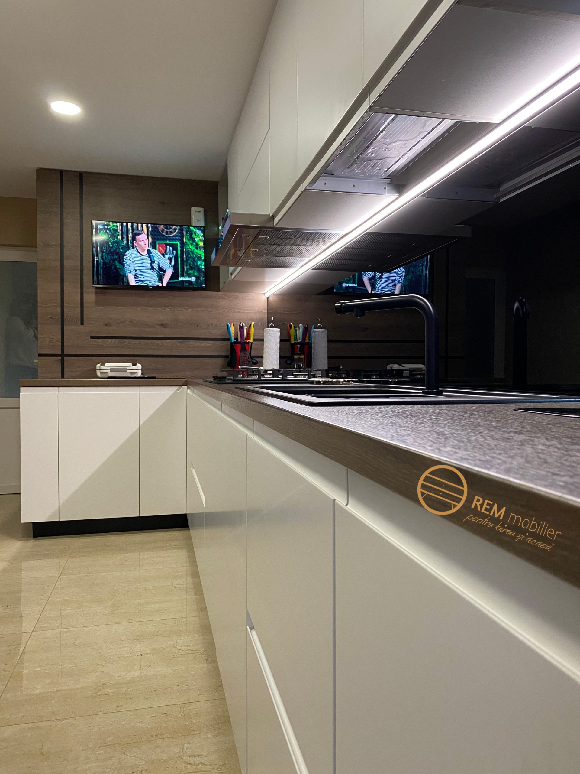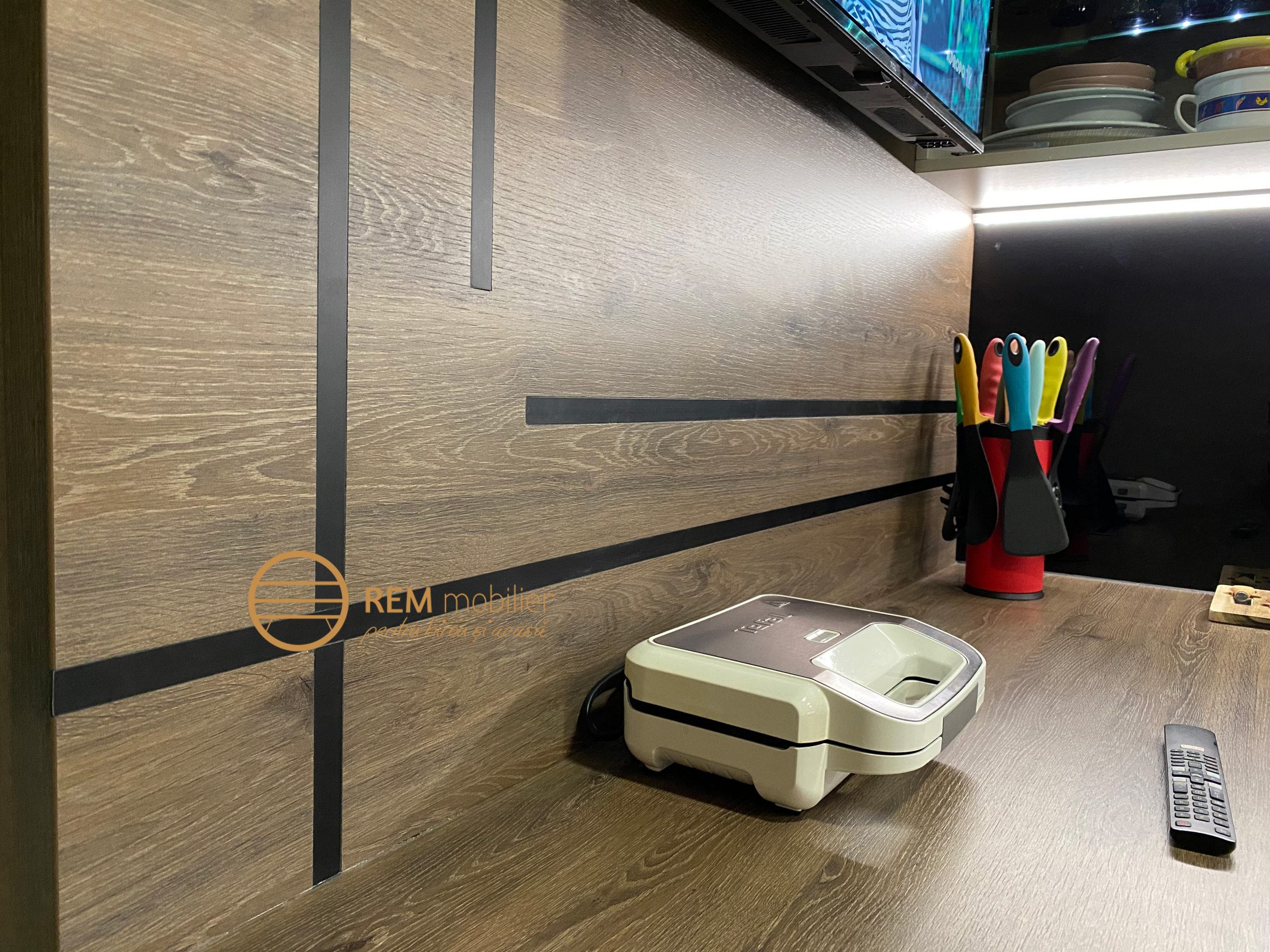 Realizata din MDF VOPSIT si pal, cu insertii metalice, prize in blat, sticla vopsita, banda led, polite cu banda led, spatii depozitare decoruri si imbinari cat mai ascunse.