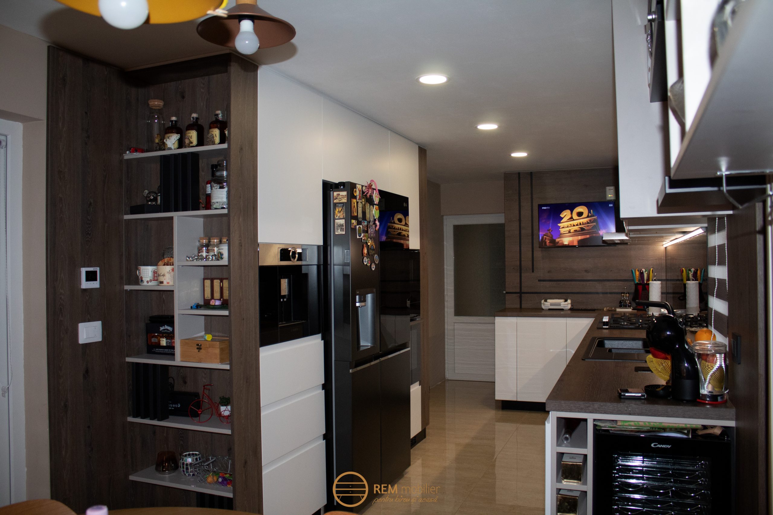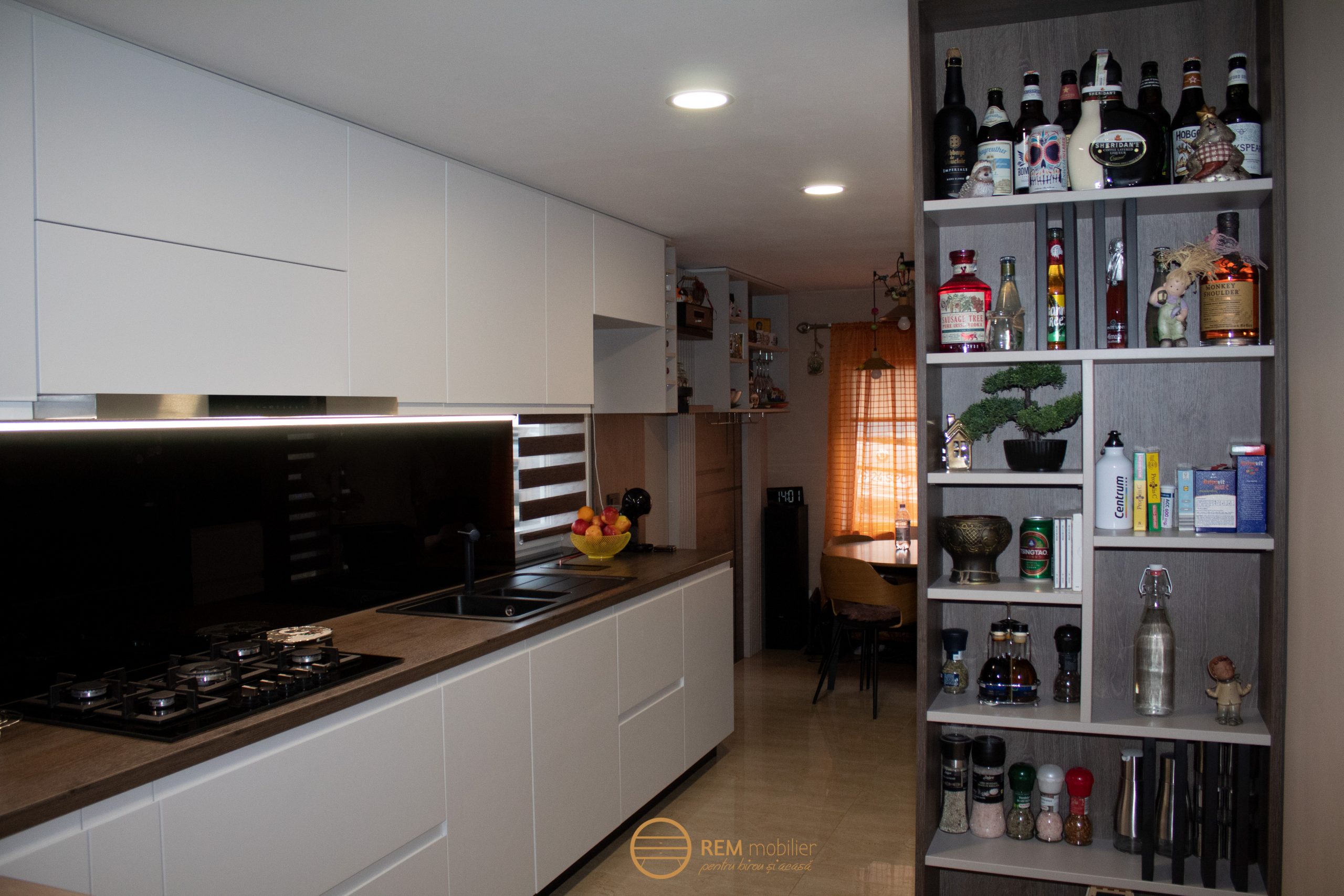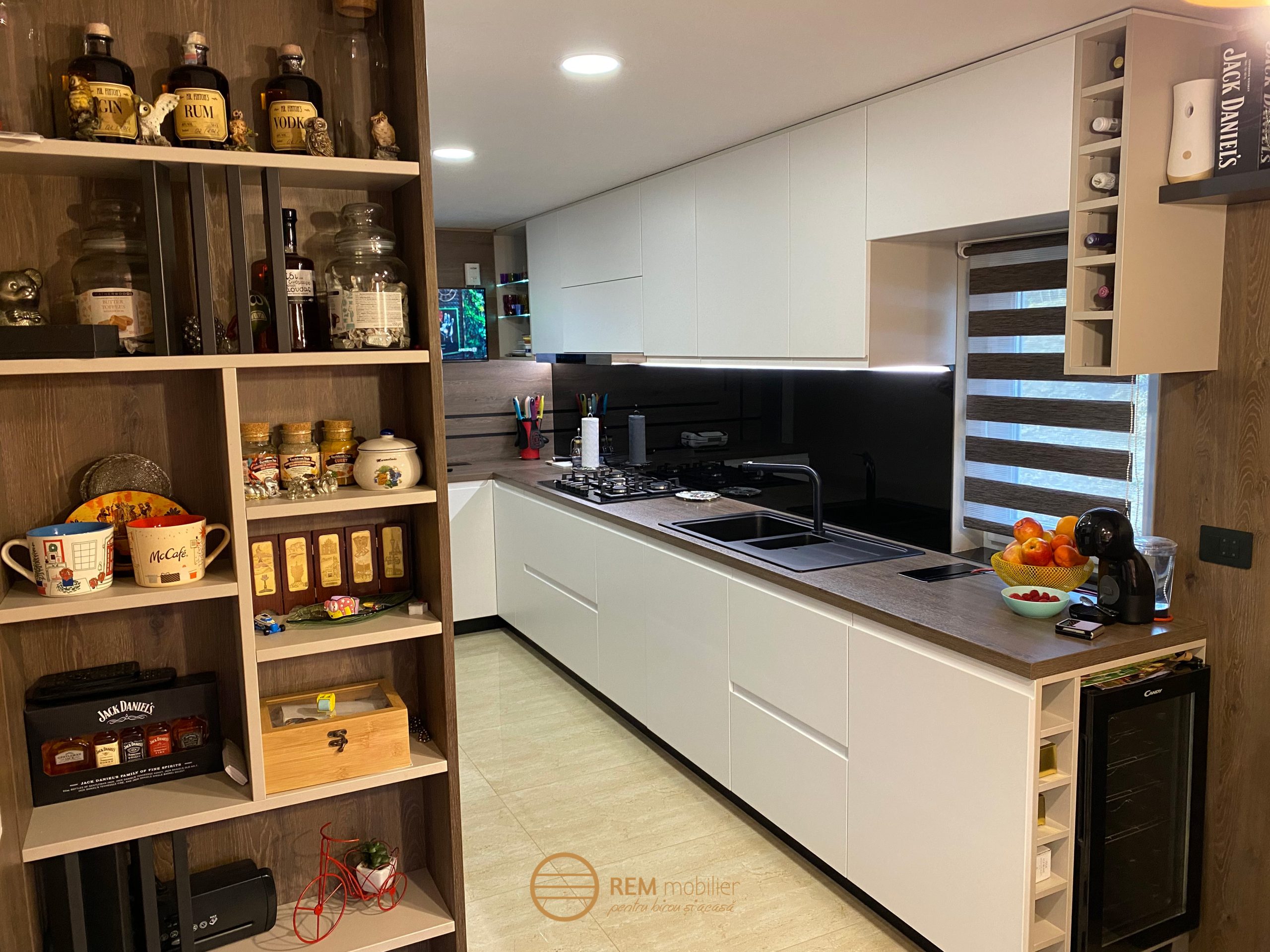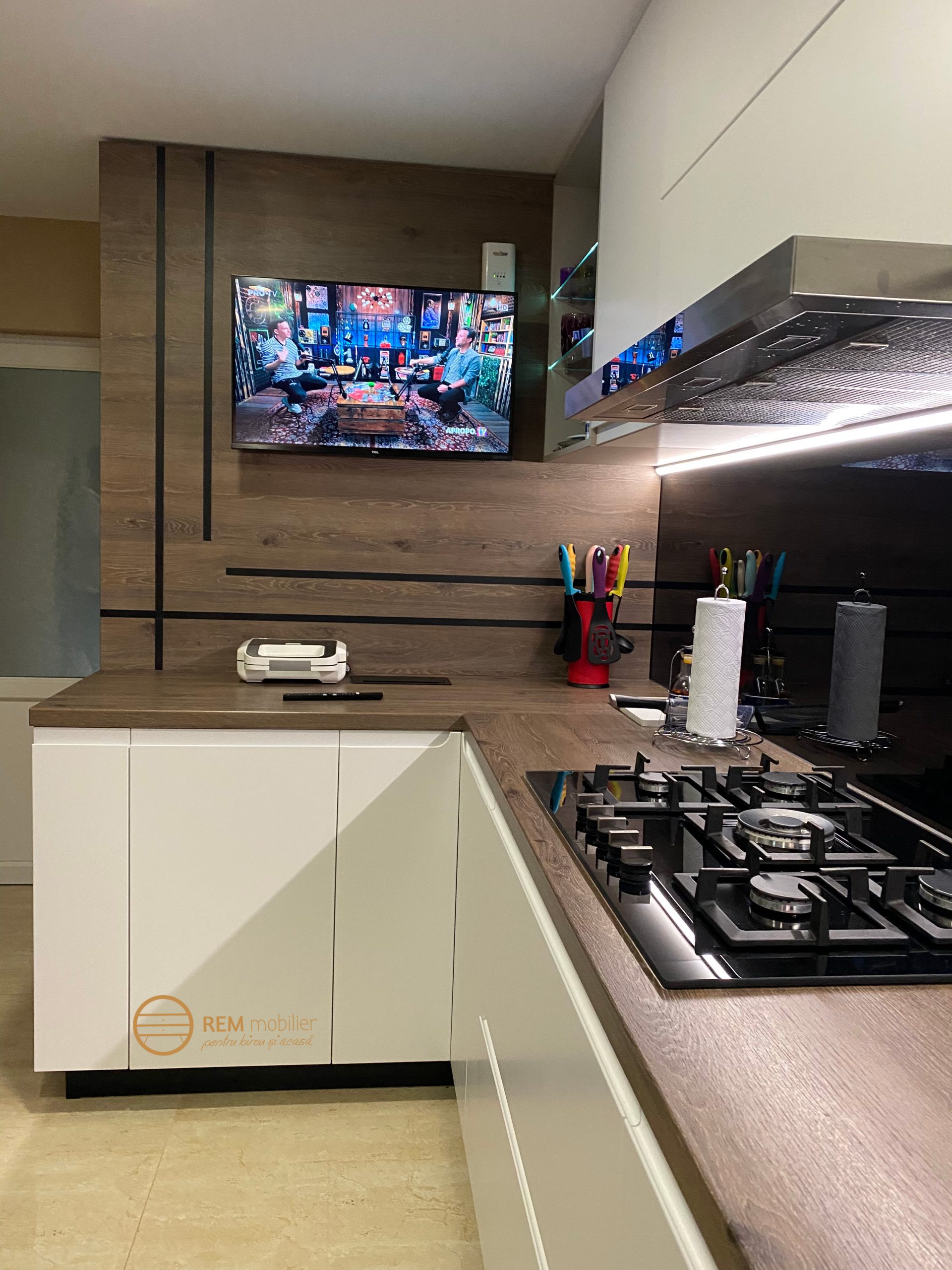 Realizata din MDF VOPSIT si pal, cu insertii metalice, prize in blat, sticla vopsita, banda led, polite cu banda led, spatii depozitare decoruri si imbinari cat mai ascunse.