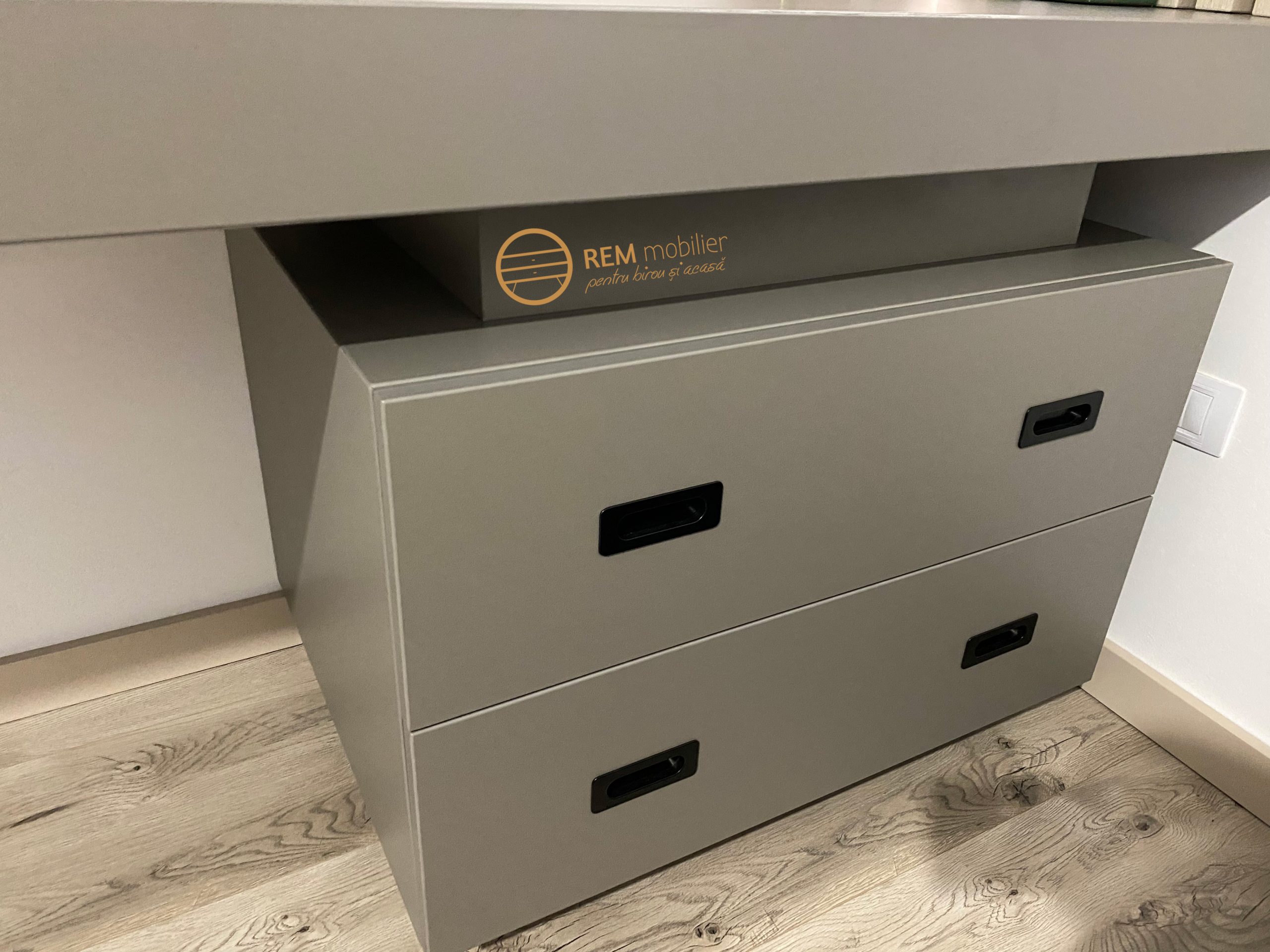 Piesele de mobilier sunt din pal, cu imbinari specifice nu doar la 45 grade, riflarile des intalnite scoase in evidenta prin luminile led ce se aprind doar prin simpla trecere a mainii pe deasupra locului unde este pozitionat senzorul.